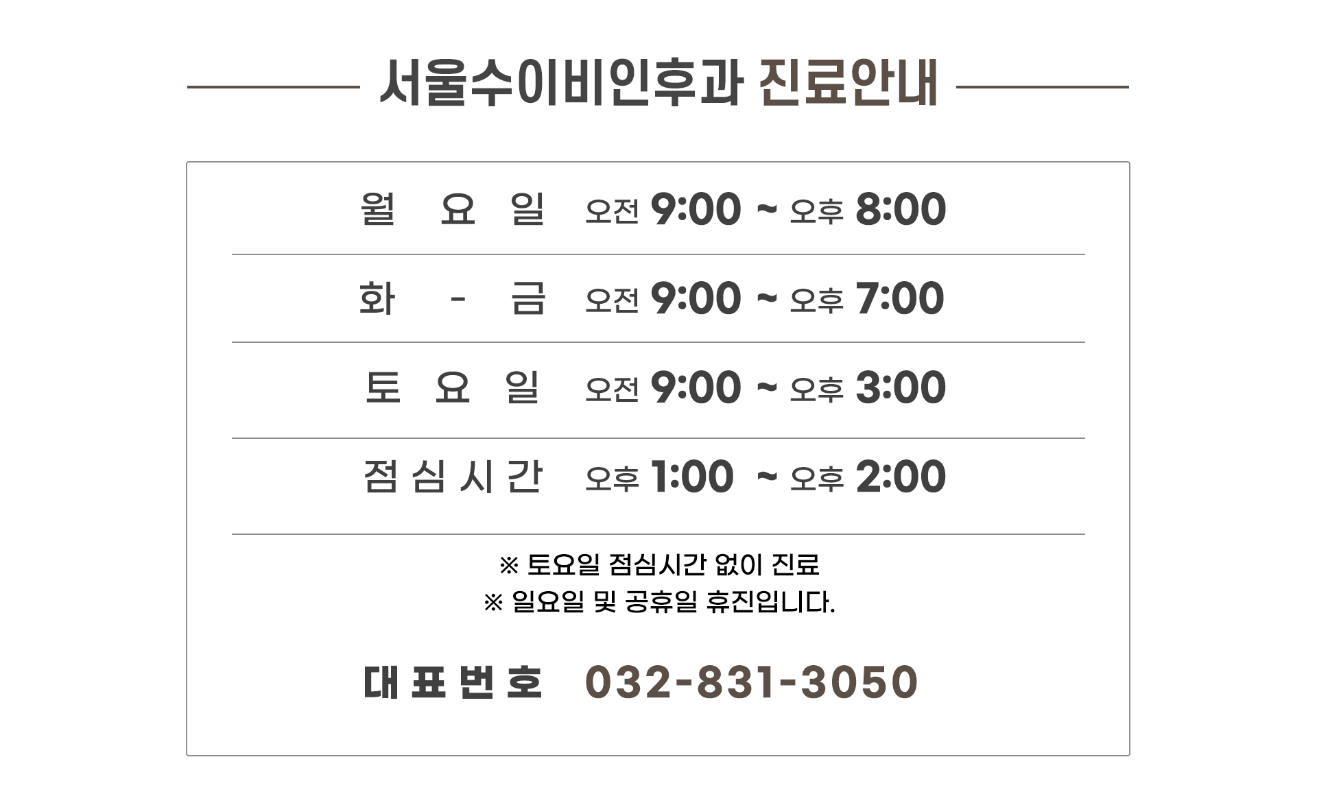 월/목 오전 9:00 - 오후 8:00 화/수/금 오전 9:00 - 오후 7:00 점심시간 오후 1:00 - 오후 2:00 토요일 오전 9:00 - 오후 3:00 일요일 및 공휴일 휴진